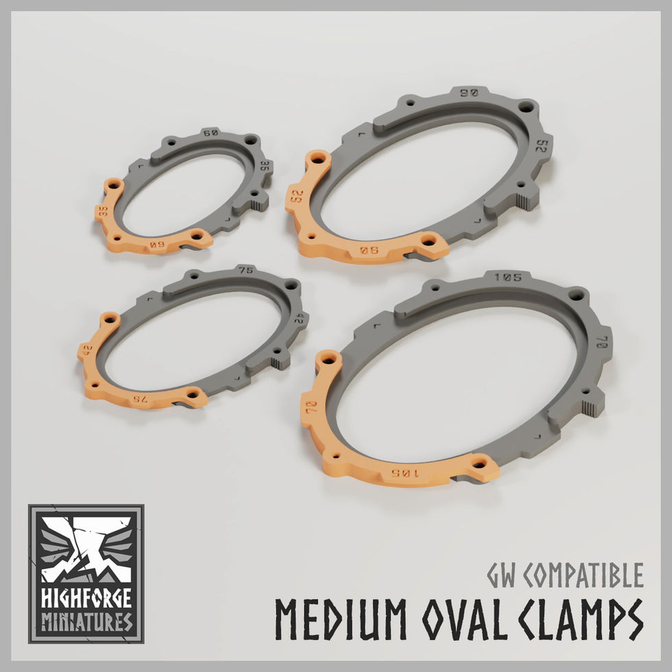 Complete set of 3D printable base clamps used to secure your based miniatures to metal transport trays. The clamps in this set are fully compatible with Games Workshop based miniature range.